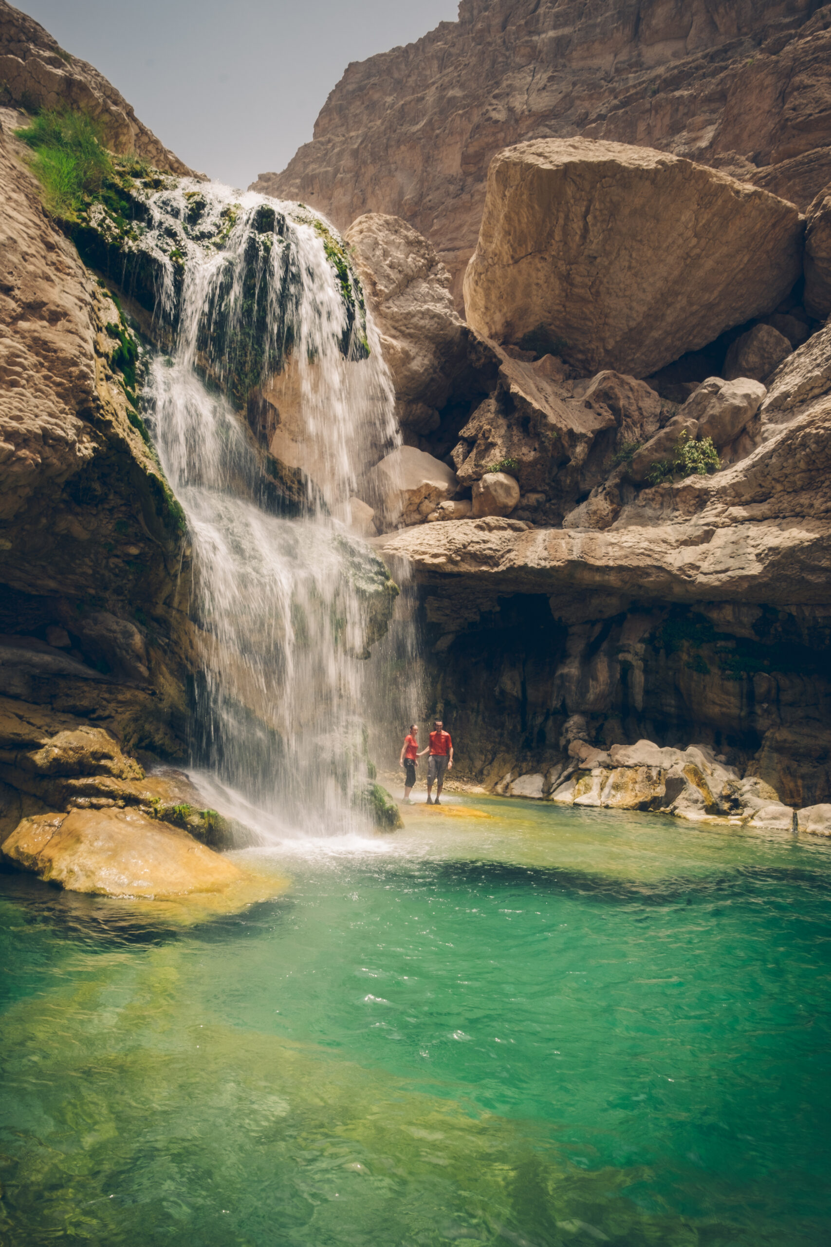 Tourists enjoy a waterfall in Wadi Al Arbaeen